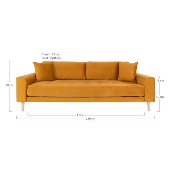 3 Seater Sofa, mustard yellow velvet with two pillows and natural wood legs